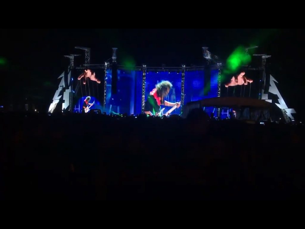 This video is used in Metallica’s World Wired tour where during the show Brian’s hands appear above drummer Lars Ulrich and guitarist Kirk Hammett and ‘puppeteer’ them from above through the iconic number.